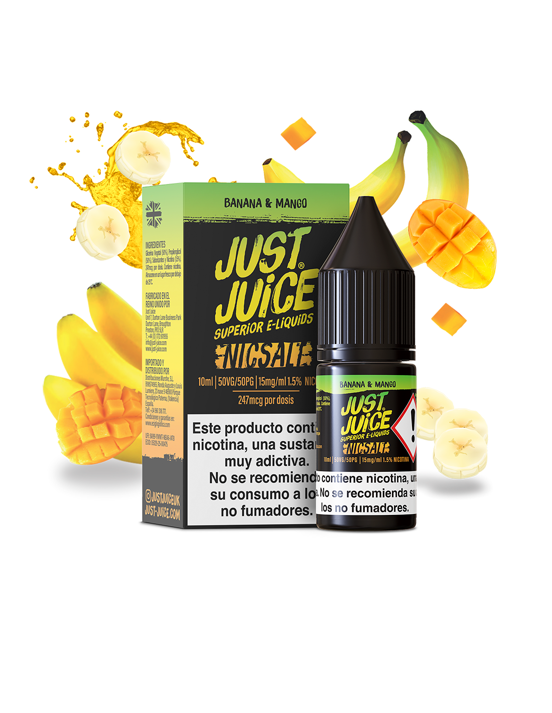 Sales de nicotina Banana & Mango Just Juice 10ml con plátano dulce y mango tropical. Disponibles en 5, 11, 15 y 20 mg, ideales para pods y vapeo MTL.