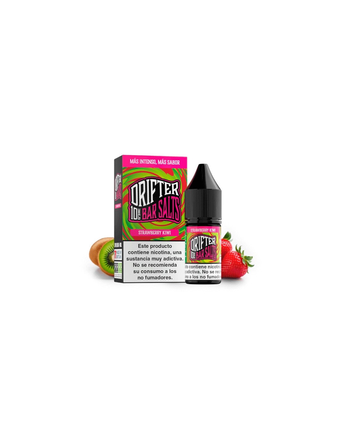 El envase de Strawberry Kiwi presenta el diseño colorido y moderno típico de la gama Drifter Bar Salts. Cada botella de 10 ml está fabricada en PET reciclable, con tapón de seguridad infantil y boquilla fina antigoteo. Cumple con la normativa TPD, garantizando la calidad y seguridad del producto.